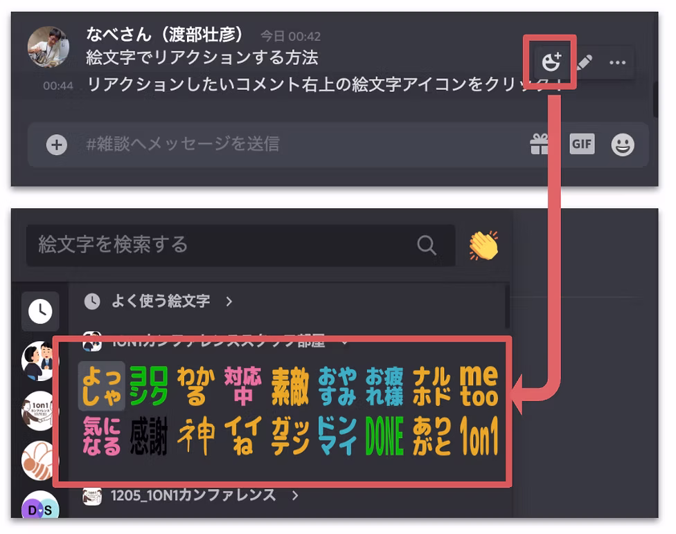 リアクションしたいコメントにマウスオーバーし、コメント右上に表示される絵文字アイコンをクリックすると、絵文字を選んでリアクションできます。