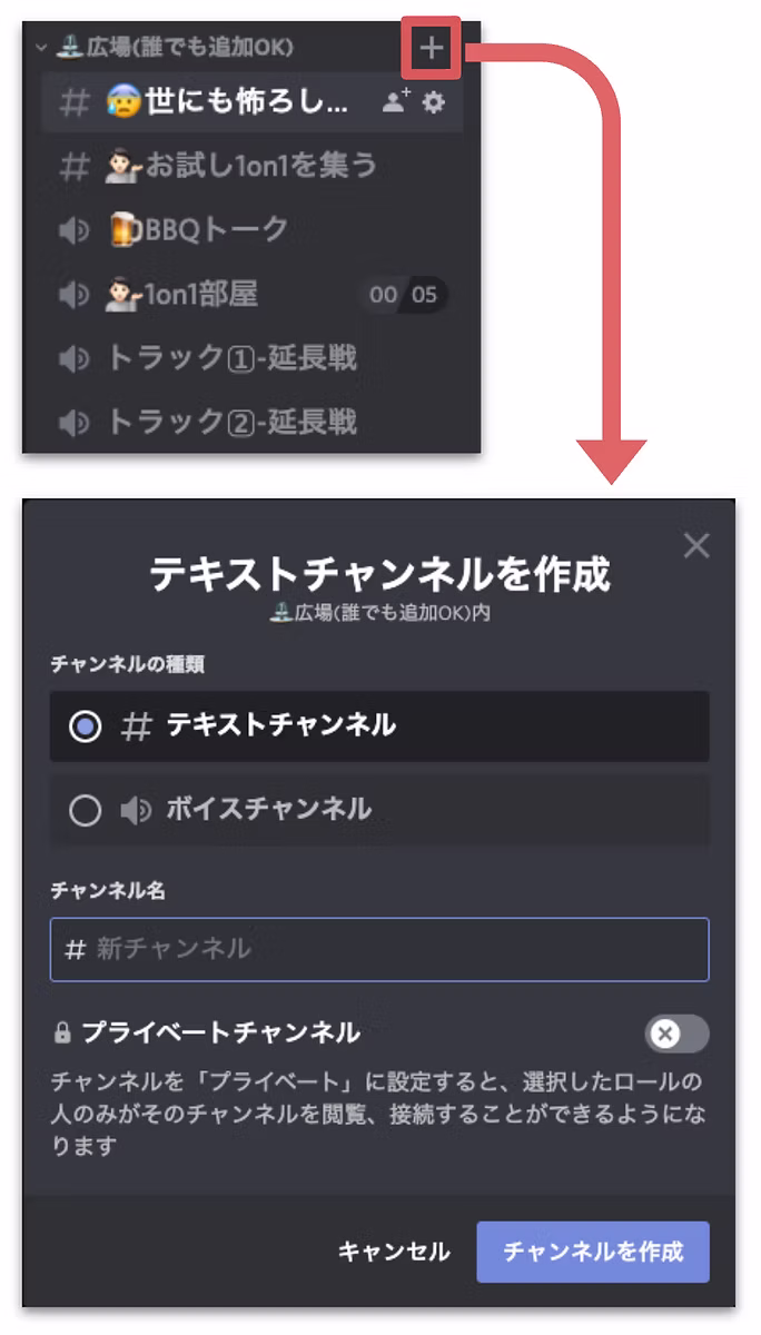チャンネルカテゴリ右側の +アイコンから、テキスト/ボイスチャンネルを作成できます。