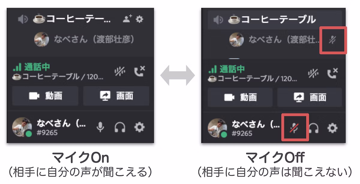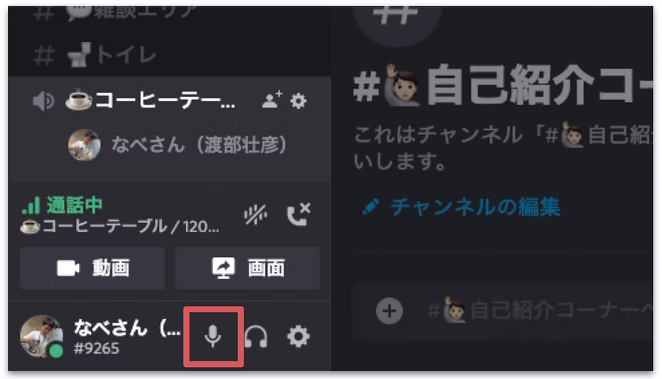 ボイスチャンネル参加時、画面下部のマイクアイコン(画像赤枠)をクリックすることで、マイクのOn / Offを切り替えることができます。