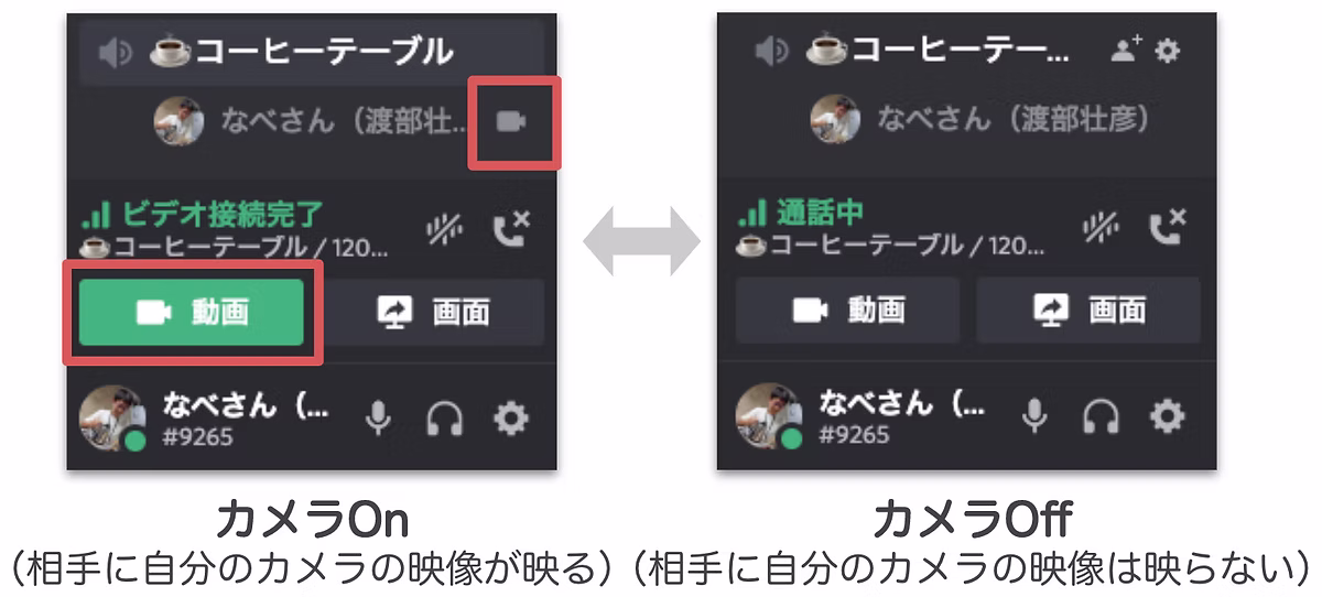 ボイスチャンネル参加時、画面下部の「動画」ボタン(画像赤枠)をクリックすることで、カメラのOn / Offを切り替えることができます。