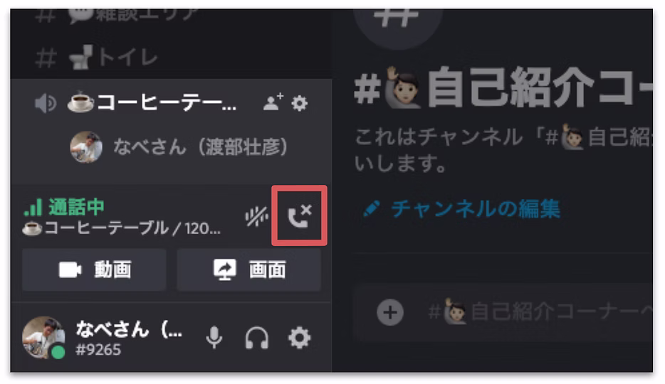 ボイスチャンネル参加時、画面下部の通話切断ボタン(画像赤枠)をクリックすることで、ボイスチャンネルから退出できます。