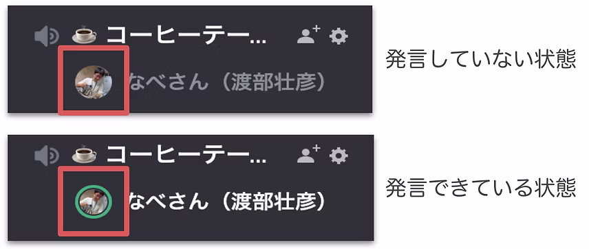 ボイスチャンネル参加時、自分のアイコンを見ることで、ちゃんと発言できているかどうかをチェックできます。