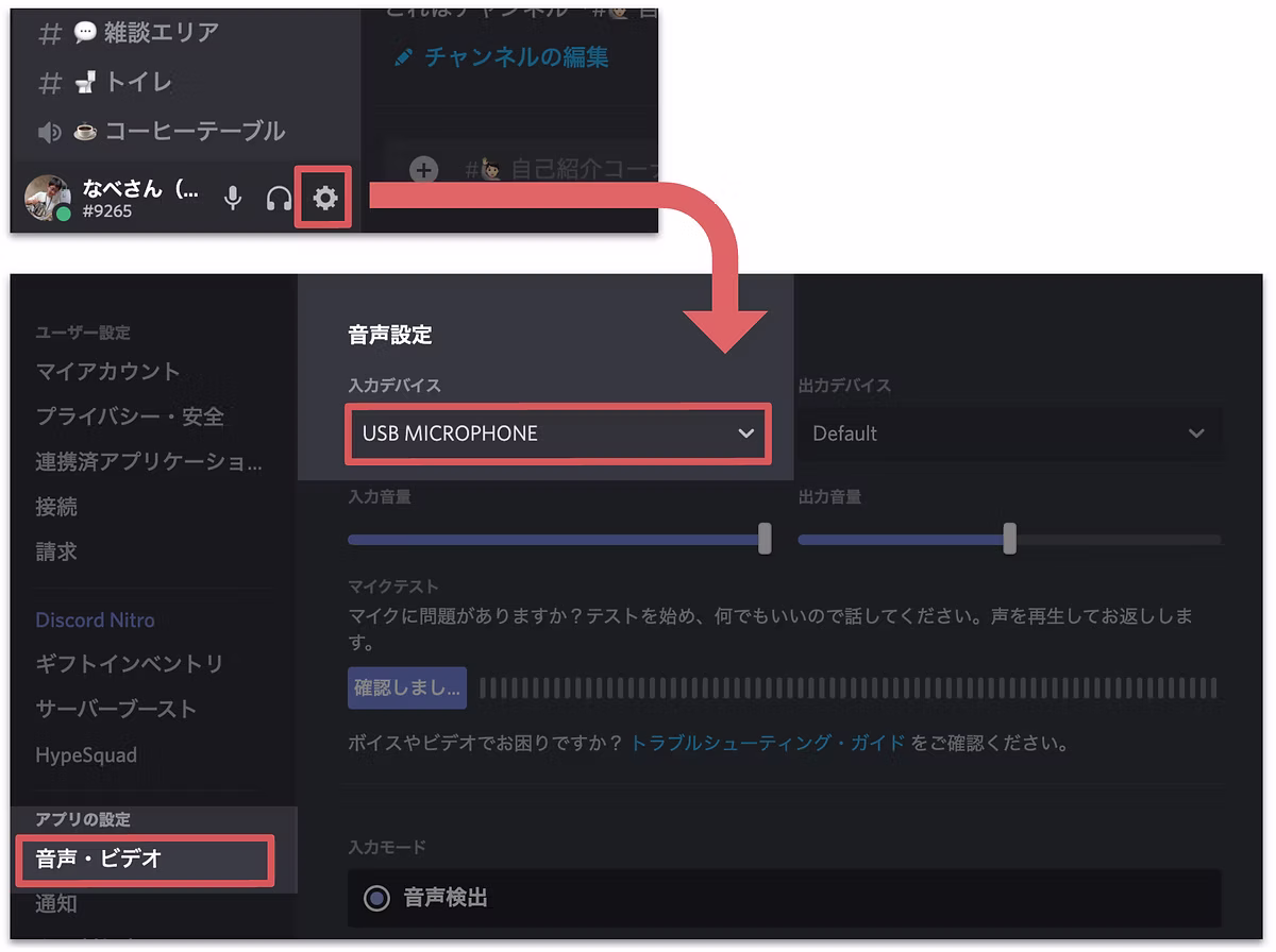 画面下部の歯車アイコンから、設定画面 > 音声・ビデオ > 入力デバイス からデバイスを選択できます。