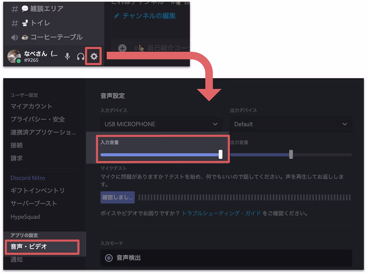 画面下部の歯車アイコンから、設定画面 > 音声・ビデオ > 入力音量 から調整できます。