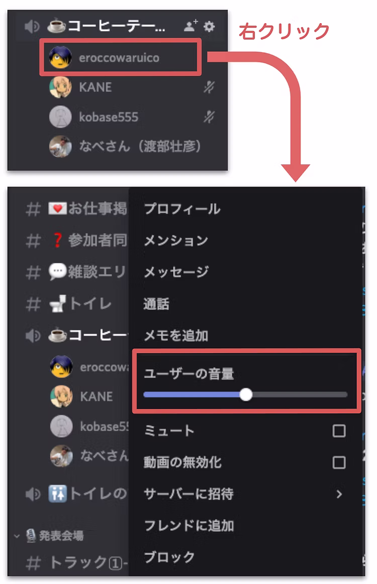 他の人から「ちょっと音が小さい / 大きすぎて割れている」と指摘がある場合は、調整を試してみてください。ボイスチャンネルの参加者を右クリック > ユーザーの音量 から、自分に聞こえる音量を個別に調整できます。